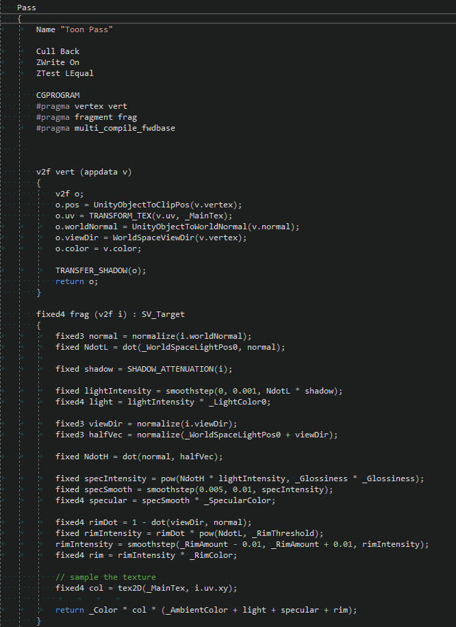 the next thing i worked on is the Toon shading for the game, i have done some experiments into shader programming before this is the first time i wrote it for use in a game.