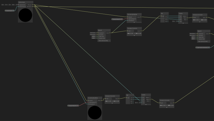 here the additional light calculations and the shading is then combined along with any additional global illumination values. the results are added to the main light node and passed out to the main toon graph